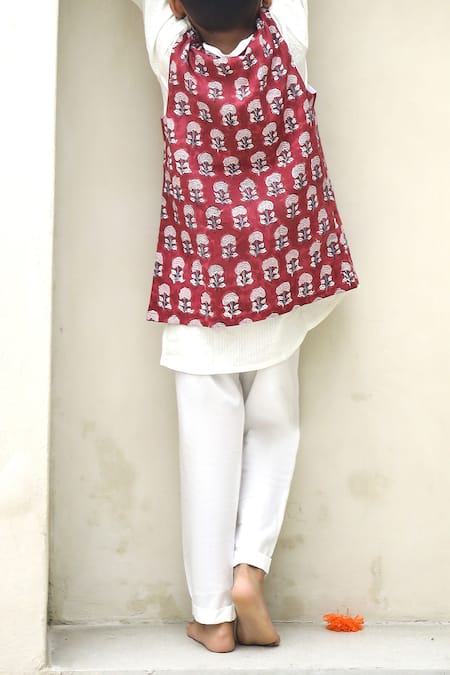 White Cotton Sequins Crimson Dahlia Kurta Set With Bundi