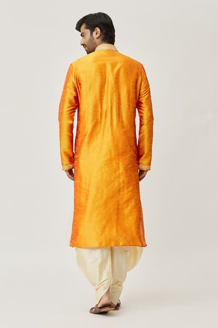 Orange kurta featuring a mandarin collar and thread embroidery on the placket and cuffs. Paired with a beige dupion silk dhoti pant.