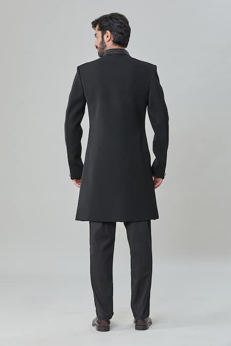 Black sherwani featuring hand embroidery with cutdana and stones. Paired with matching pant for a complete look.