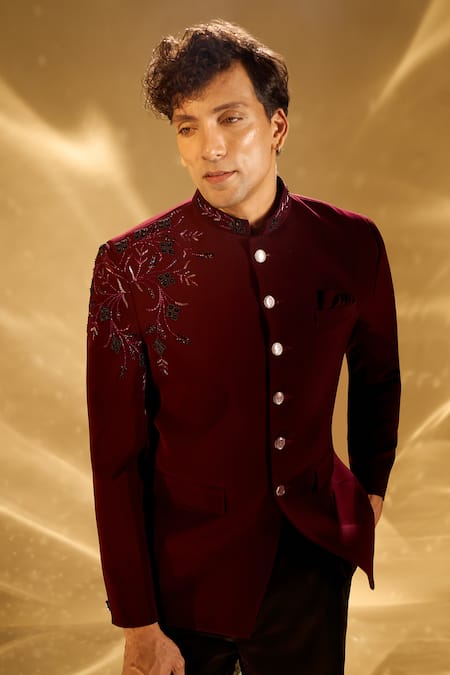 A wine bandhgala crafted from imported art silk fabric with faux satin lining, featuring cutdana placed embroidery and hand work detailing.