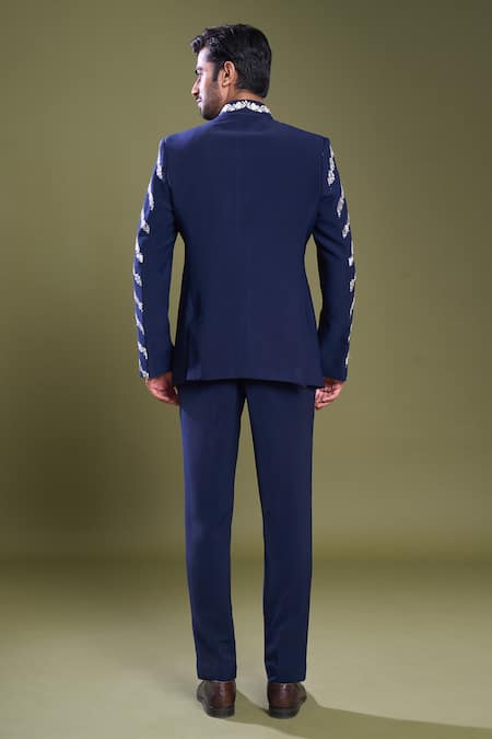 Blue bandhgala featuring full sleeves and daisy garden embroidery. Paired with matching pants in a Japanese viscose blend.