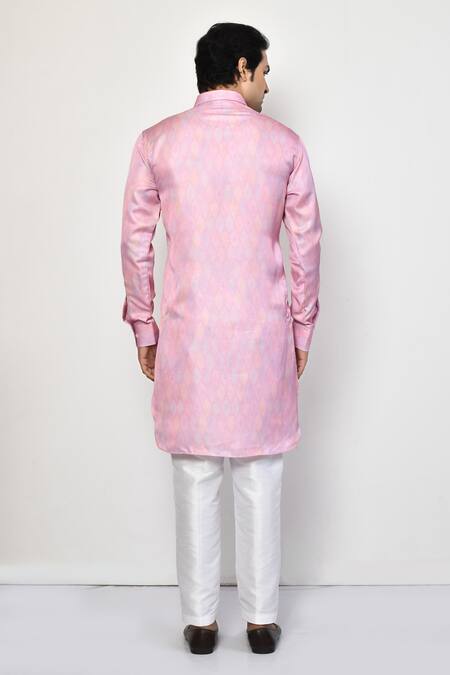 Pink kurta featuring a diamond pattern with a collared neck and full sleeves. Paired with a cotton blend pant for a complete look.