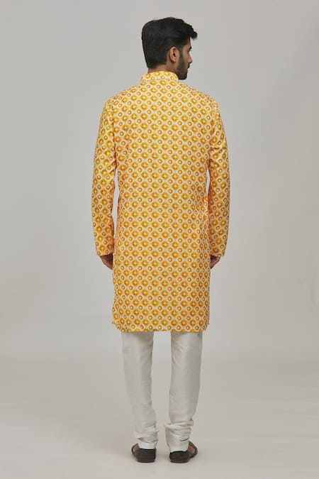 Yellow kurta featuring diamond prints, mandarin collar, and full sleeves. Paired with a white churidar for a complete look.