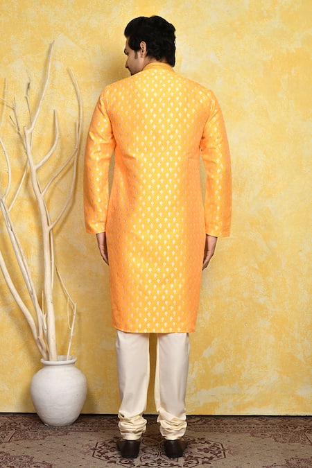 Yellow kurta featuring diamond woven motifs, full sleeves, and mandarin collar. Paired with a cream churidar with an elasticated waistband.
