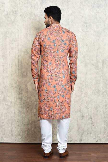 Orange linen kurta featuring a floral digital print and a band collar