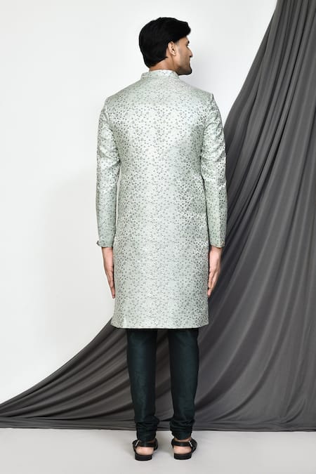 Green Silk, Jacquard Ditsy Layered Sherwani Set