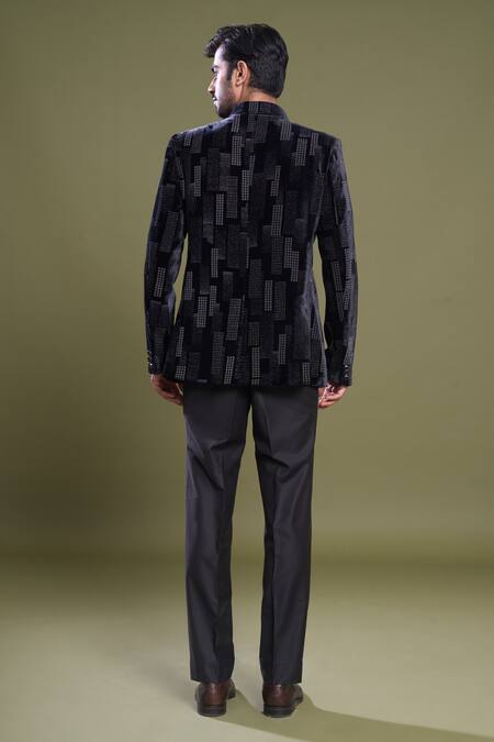 Black bandhgala featuring full sleeves and embossed galaxy block detailing. Paired with a matching pant in a Japanese viscose blend fabric.
