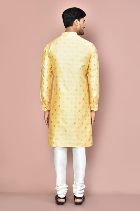 Asymmetric hem with gold statement buttons, Machine embroidered patterns throughout the kurta