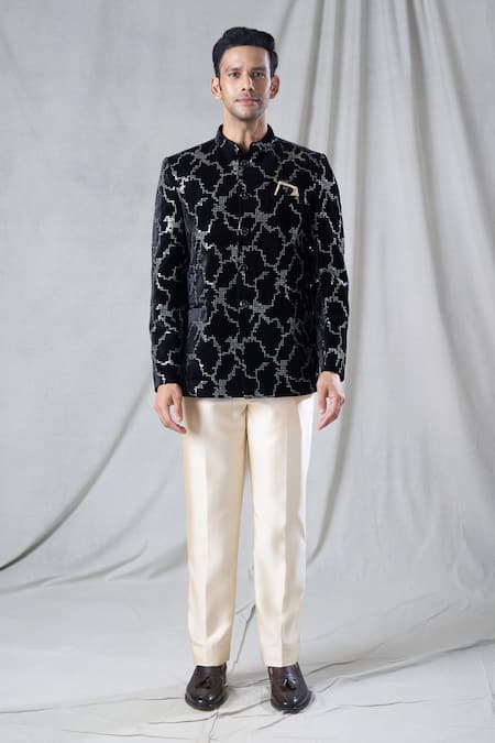 Black velvet bandhgala featuring sequin embroidery in an abstract pattern. Paired with light gold pants made of terry rayon.
