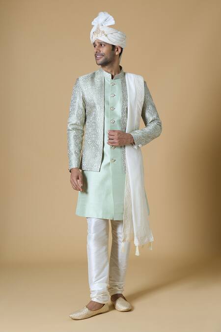 Jacket, sherwani, churidar and kalangi worn by the model is not for sale.
