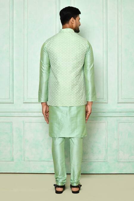 Green Kurta Silk And Pyjama Cotton Embroidery Thread Bundi & Set