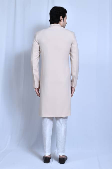 Buy_Arihant Rai Sinha_Beige Lycra, Silk Embroidered Collar Plain Sherwani With Pant_Online_at_Aza_Fashions