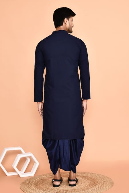 Navy blue cotton kurta featuring metallic embroidery and a band collar. Paired with off-white art silk dhoti pant.
