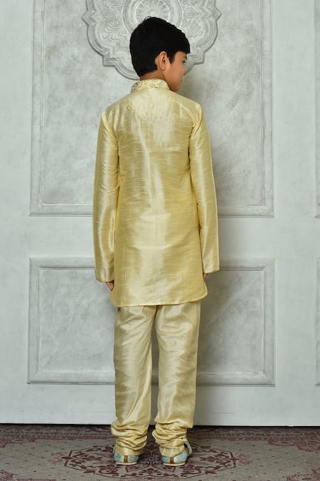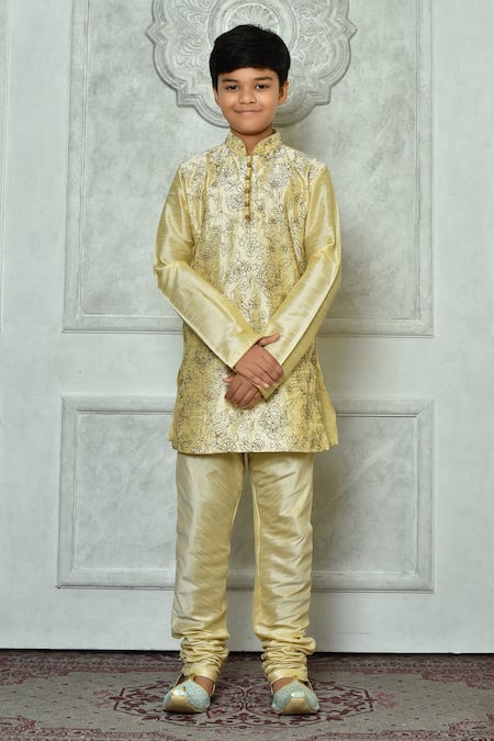 Petite Pomme_Beige Silk Embroidery Full Sleeve Kurta Set _Online_at_Aza_Fashions