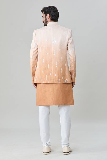 Peach jacket featuring mirror and thread embroidery with a mandarin collar. Paired with a sleeveless kurta and white churidar.
