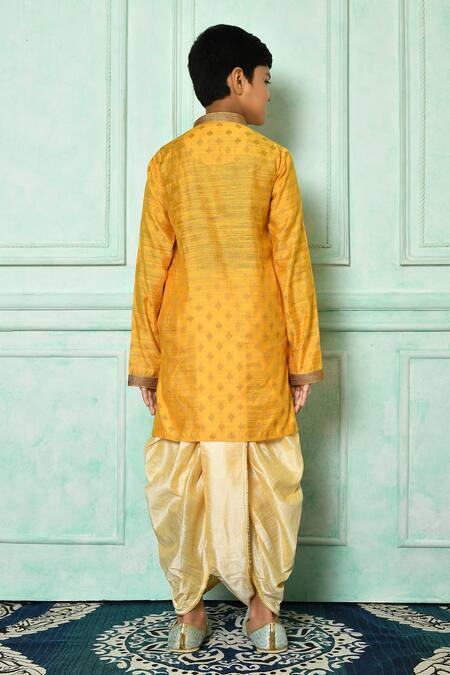 Yellow dupion art silk kurta featuring a mandarin neckline and full sleeves. Paired with a beige dhoti that complements the kurta's embroidery.