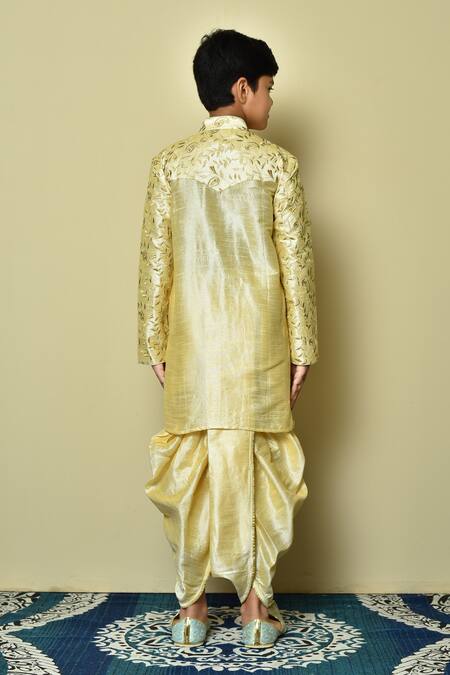 Beige kurta featuring embroidered paisley patterns and golden piping. Paired with plain beige dhoti pant with side slits.