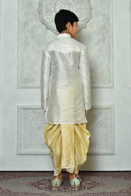 Off white dupion art silk kurta featuring paisley patterned embroidery and a mandarin collar. Paired with beige dhoti pant with an elasticated waist and gold piping details.