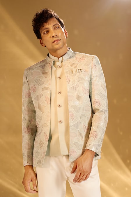 A pista green bandhgala crafted from art silk with hand embroidery and faux satin lining. It is paired with a sleeveless shirt.
