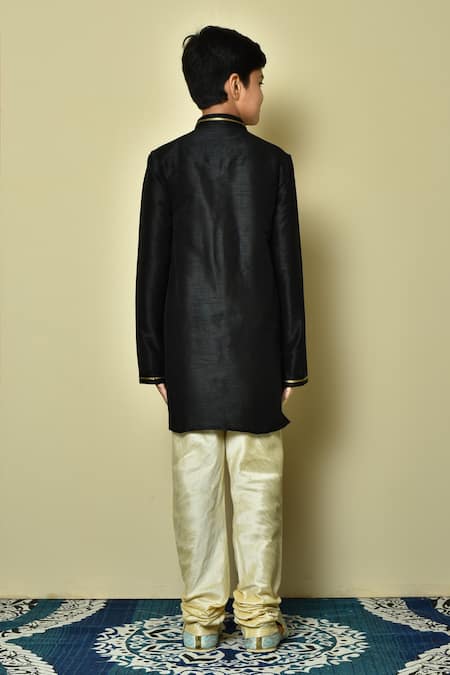 Black dupion art silk kurta featuring an embroidered placket and collar. Paired with a beige churidar for a complete look.