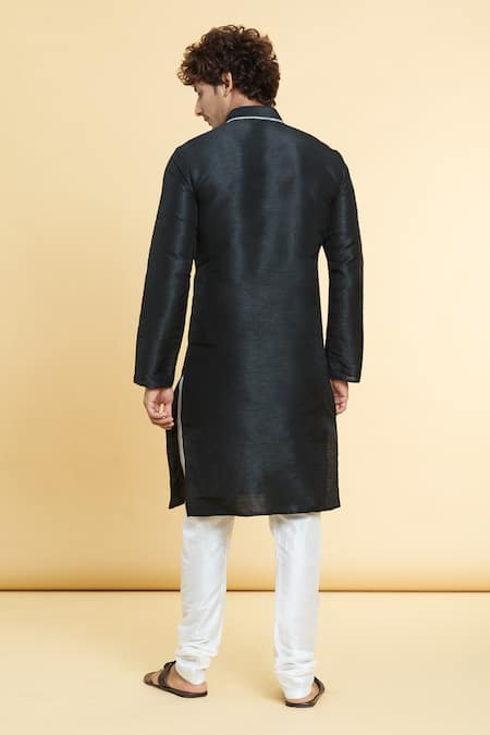 Black kurta featuring a contrast embroidered placket and stand collar. Paired with an off-white churidar made from dupion art silk.