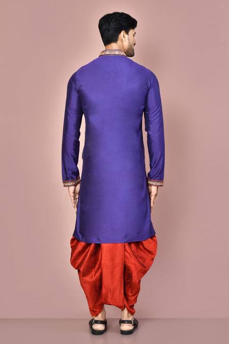 Purple kurta featuring a stand collar and full sleeves with embroidered cuffs. Paired with a red dhoti pant, this set showcases placement embroidery and thread work.