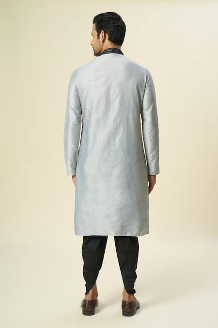 Grey kurta featuring full sleeves and a mandarin collar with black toned embroidery on the placket. Paired with a black patiala pant for a complete look.