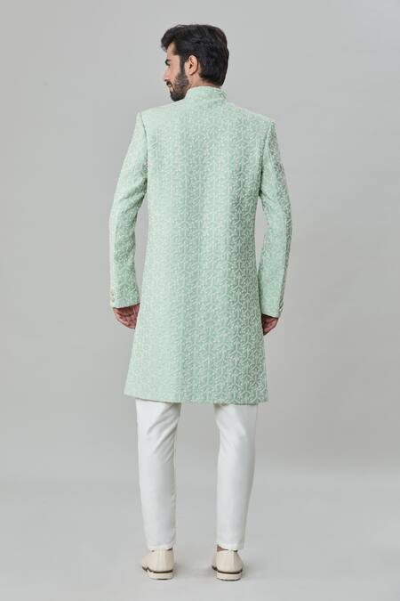 Sea green sherwani featuring thread and sequins embroidery with a Mandarin collar. Paired with white pant and a matching dupatta.