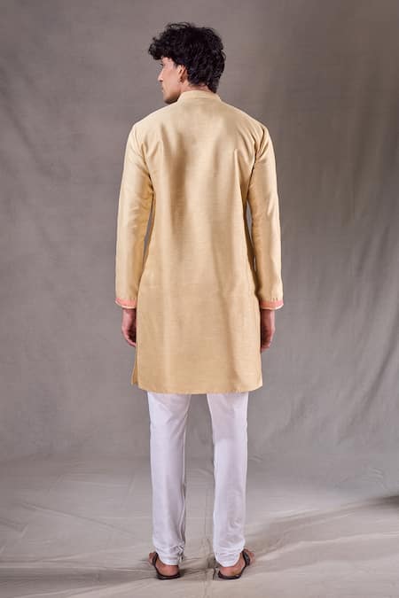 Gold kurta featuring a pink panel with leaf thread embroidery
