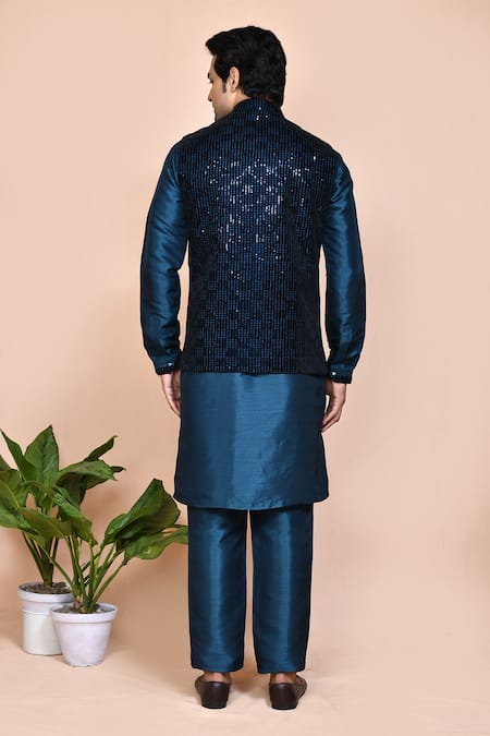 Aqua blue bundi featuring all-over checkered stripe pattern with tonal thread and sequin embroidery. Paired with a full sleeve kurta and straight fit pant, includes a pocket square and embellished tasselled brooch.