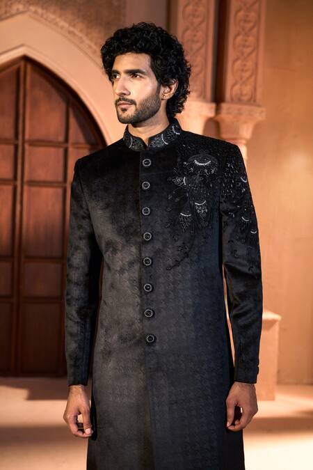 A black sherwani crafted from embossed velvet fabric with an attached faux satin lining, featuring hand embroidery on the shoulder and collar. It is paired with a black pant made from dupion art silk fabric.