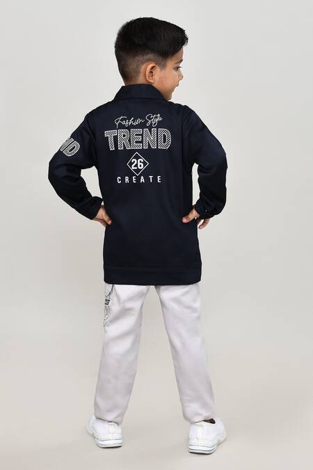 Navy blue jacket featuring full sleeves with decorative patches. Paired with a white t-shirt and grey trousers.