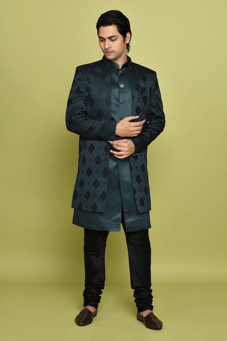 Green feather pattern sherwani crafted from Gorgia Tuxido Satin. Paired with a solid sleeveless inner kurta and a black dupion art silk churidar.