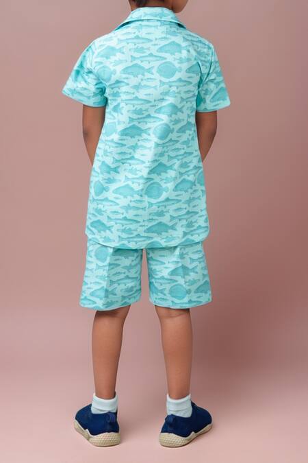 Blue cotton shirt featuring a fish print design with a button-down front. Paired with matching blue cotton shorts.