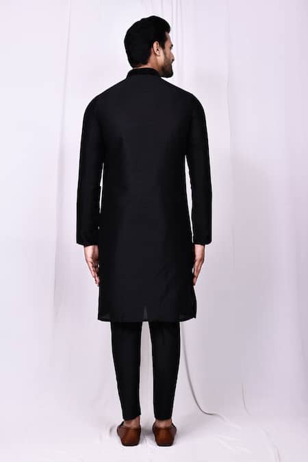 Black kurta featuring a flora embroidered band collar and half placket. Paired with a matching pant pyjama for a complete look.