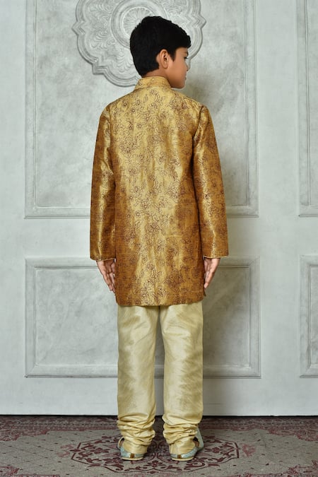 Brown kurta featuring floral and paisley thread work with a mandarin collar. Paired with a beige churidar.