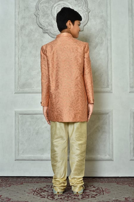 Peach Jacquard, Silk Embroidery Flora Pattern Sherwani And Churidar Set
