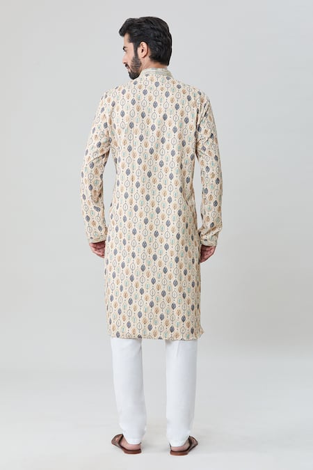 Mandarin collar with front button closure, Thread embroidery detailing, Floral and abstract print pattern