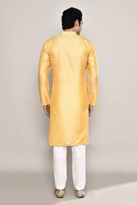 Yellow kurta featuring a floral butti pattern with a stand collar and full sleeves