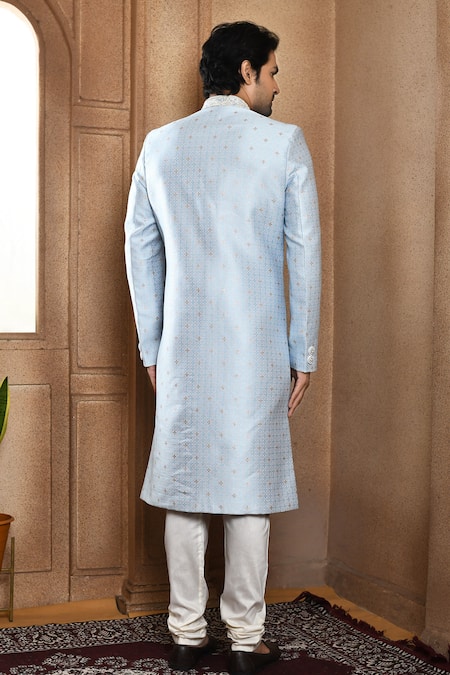Blue sherwani featuring an all-over floral resham pattern and woven details. Paired with an off-white churidar made from silk blend fabric.