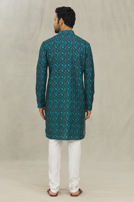 Blue jacquard kurta featuring an all-over floral checkered bandhani print and a mandarin collar