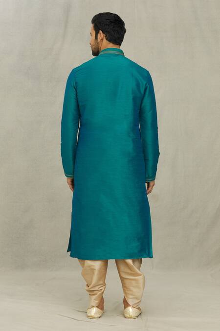 Rama green art silk kurta featuring embroidered collar and front button placket. Paired with dark beige pleated cowl draped dhoti pant with elasticated waistband.