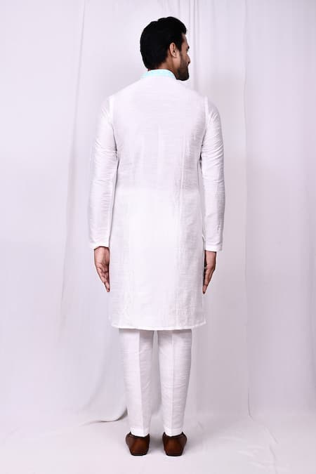 White Silk Embroidery Floral Band Collar Kurta With Pant Pyjama