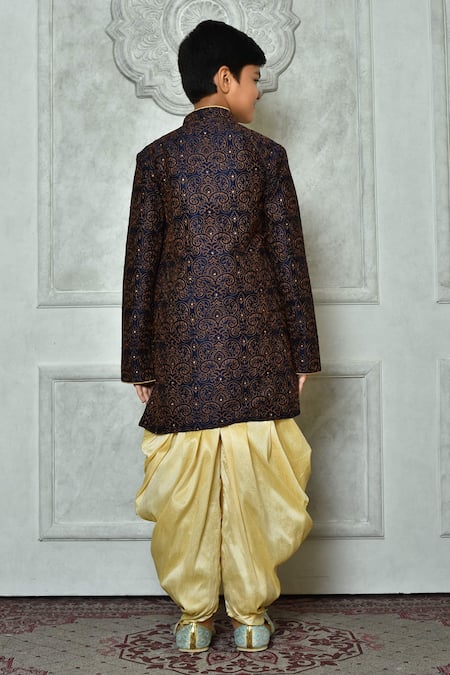 Navy blue kurta featuring floral and paisley thread work with a mandarin collar. Paired with beige Patiala pant.