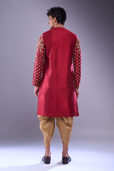 Maroon kurta featuring floral, geometric, aari, and mirror embroidery. Paired with a brown patiala pant in art silk.