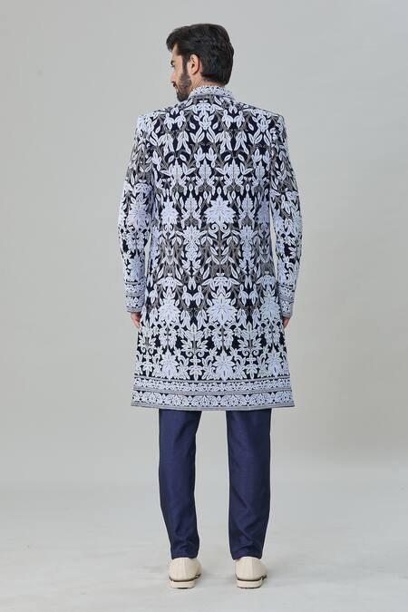 Blue Velvet, Cotton Embroidery Floral Sherwani Pant Set