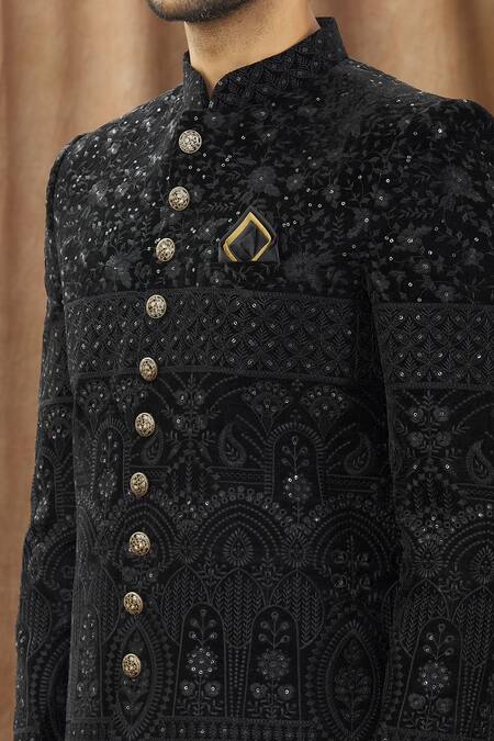 Black sherwani featuring floral embroidery with a mandarin collar and full sleeves. Paired with a black churidar made from dupion art silk.