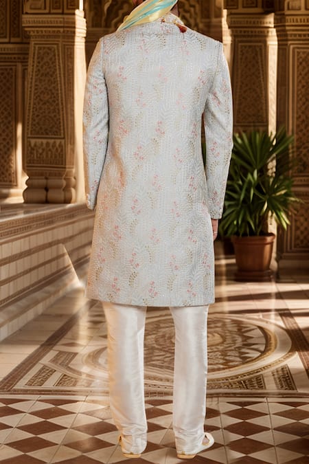 Grey floral embroidered sherwani featuring full sleeves, mandarin collar, and front button closure. Paired with off-white churidar pant and a grey border embroidered stole.