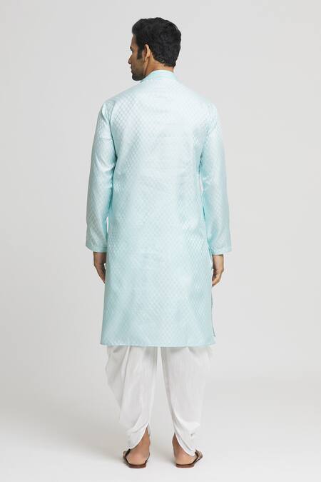 Sky blue kurta featuring a floral geometric pattern with embroidered placket, collar, and sleeves. Paired with a white dhoti pant for a complete look.