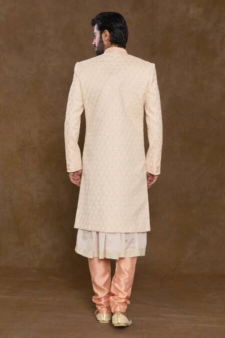 Peach Acrylic, Silk, Denim Sequins, Beads Floral Hand Work Sherwani Kurta Set